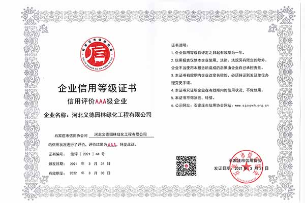 近幾年來我公司被授予2019年-2022年河北省扶貧龍頭企業(yè)、2018年國家林業(yè)標(biāo)準(zhǔn)化示范企業(yè)、2019年度全國苗圃50強(qiáng)、2018-2019年度河北省林業(yè)重點(diǎn)龍頭企業(yè)、2018年保定市精品特色現(xiàn)代農(nóng)業(yè)園區(qū)、2018年度保定林木種苗協(xié)會授予特色苗圃、2018年度北方十佳特色苗圃、2016-2019年河北省建設(shè)工程招標(biāo)投標(biāo)誠實(shí)守信5A級施工企業(yè)等榮譽(yù)稱號,2017年保定市林木種苗龍頭企業(yè)、石家莊市2017年度優(yōu)秀園林企業(yè)。